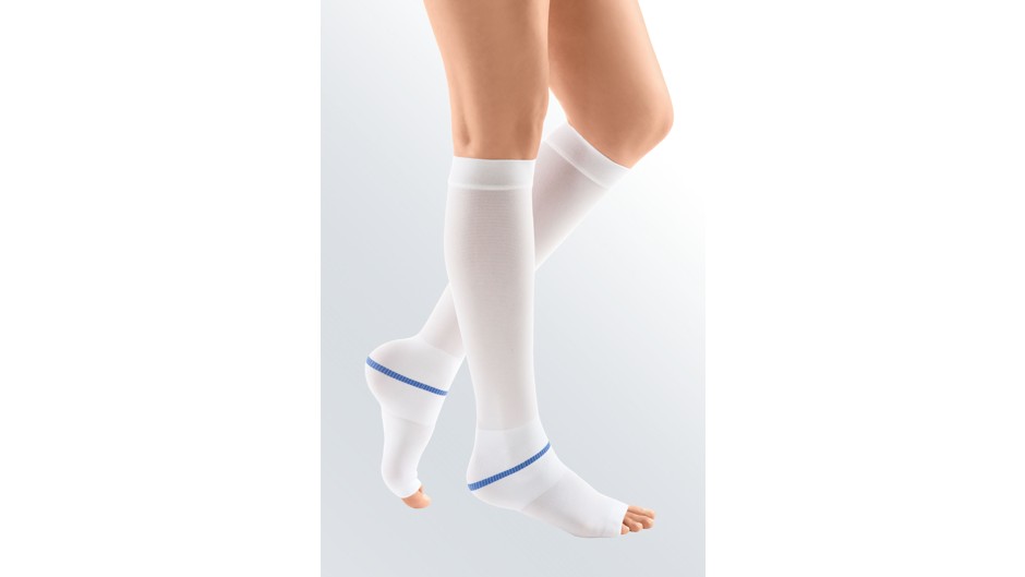 A biqueira aberta simplifica os cuidados de higiene e um controle fácil e rápido da perfusão capilar periférica sem ter de descalçar a meia. A banda de silicone inteligente permite confirmar a escolha do tamanho adequado e proporciona uma fixação segura. A malha na região da articulação do tornozelo foi especialmente concebida para evitar a formação de pregas.